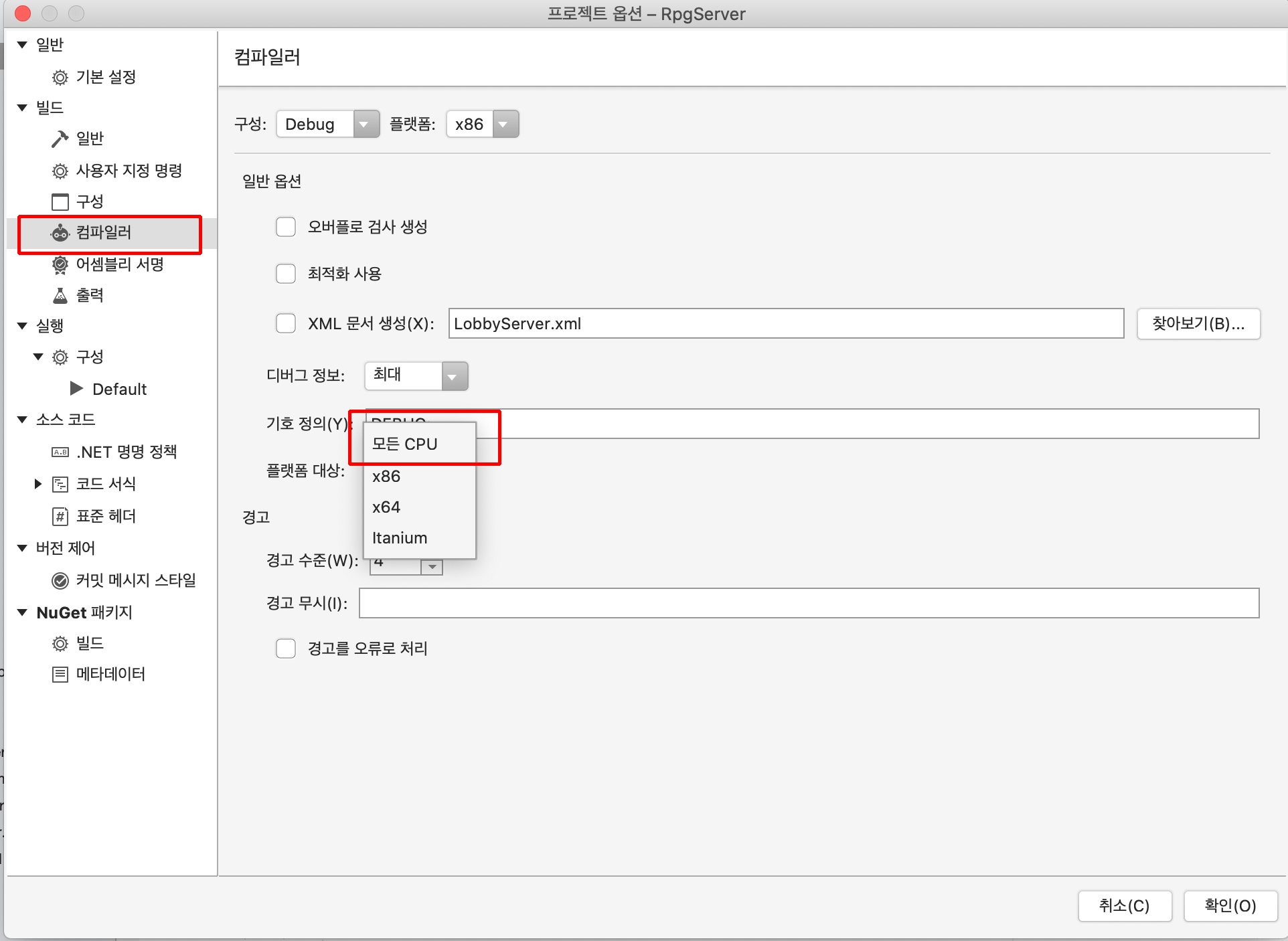 컴파일러가 기본으로 x86으로 돼 있는데, 이걸 모든 CPU(Any CPU)를 선택해주도록 하자.