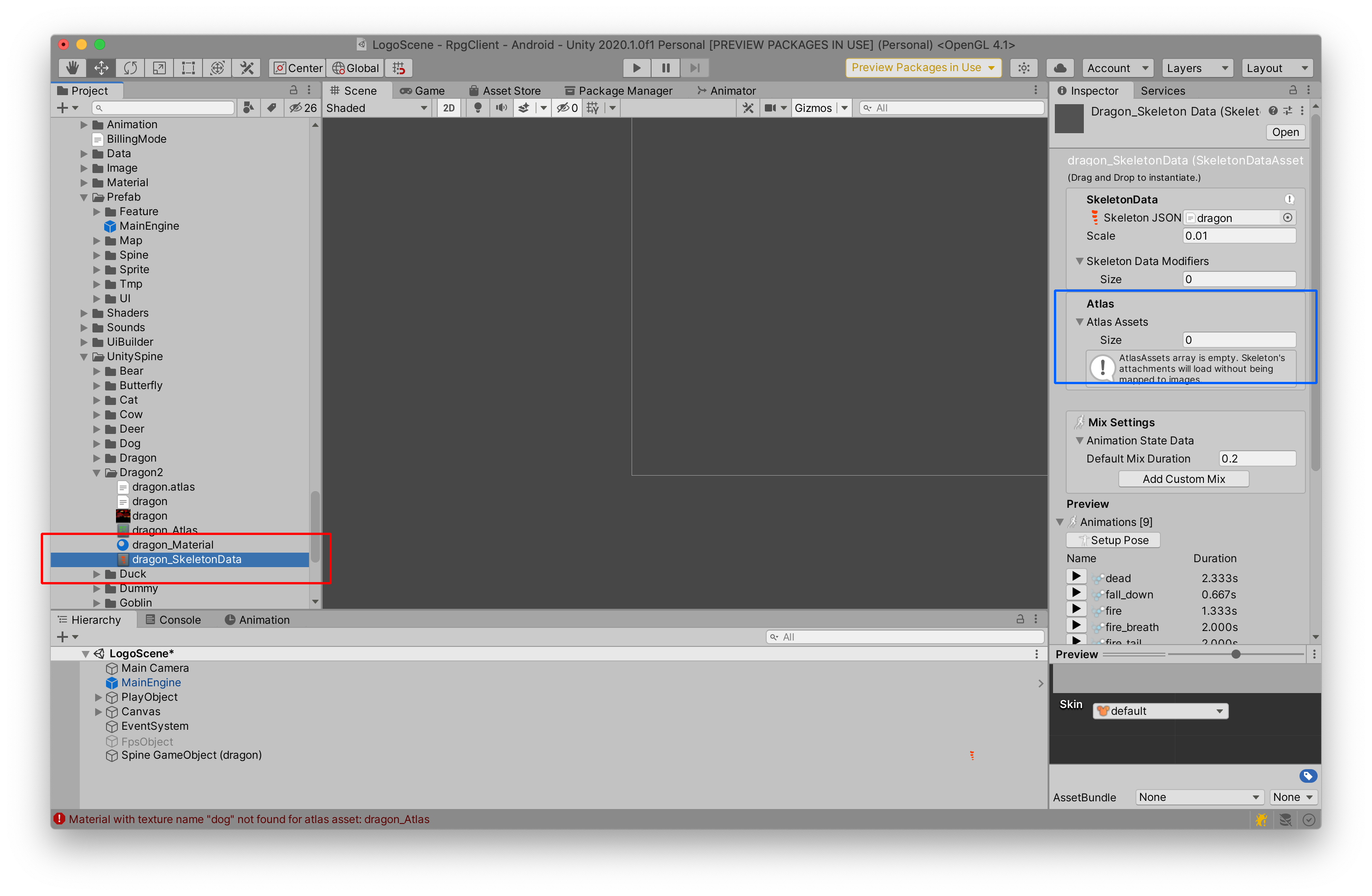 임포트 후 생성된, SkeletonData 파일을 클릭한 후, Inspector를 보면, Atlas Assets Size가 0임을 확인 할 수 있다.