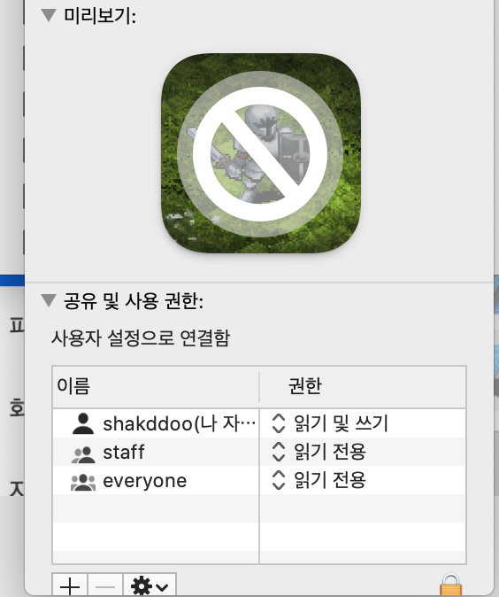 이번엔 생성된 app파일의 권한이 없다고 나왔다. 그래서 카탈리나 os에 새롭게 생긴 접근 권한이 문제인가 해서, 아래 그림과 같이 권한을 줘 봤는데도, 저 에러는 해결되지 않았다.